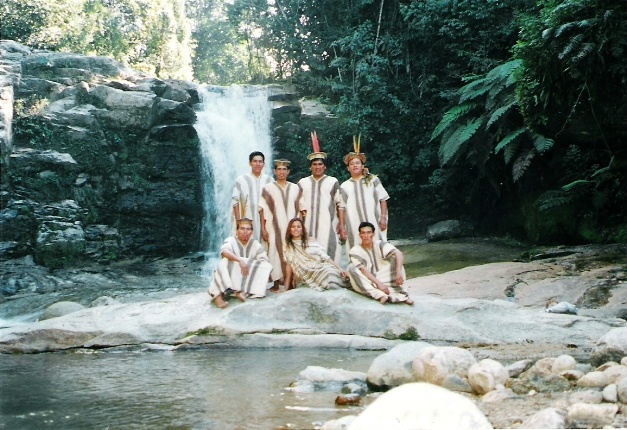 Group of native guides with a beautiful visitor by natural swimming pool under impressive waterfall. . . . Grupo de guías nativos con bella visitante junto a la piscina natural con su imponente catarata. . . .