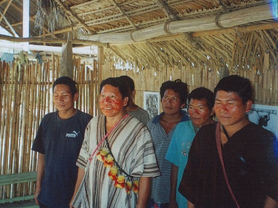 Jefe César Bustamante (con vestimenta típica) acompañado de líderes Asháninkas de la Comunidad de Cutivireni . Chief César Bustamante (with typical garment) accompanied by Ashaninka leaders of the Cutivireni Community. .