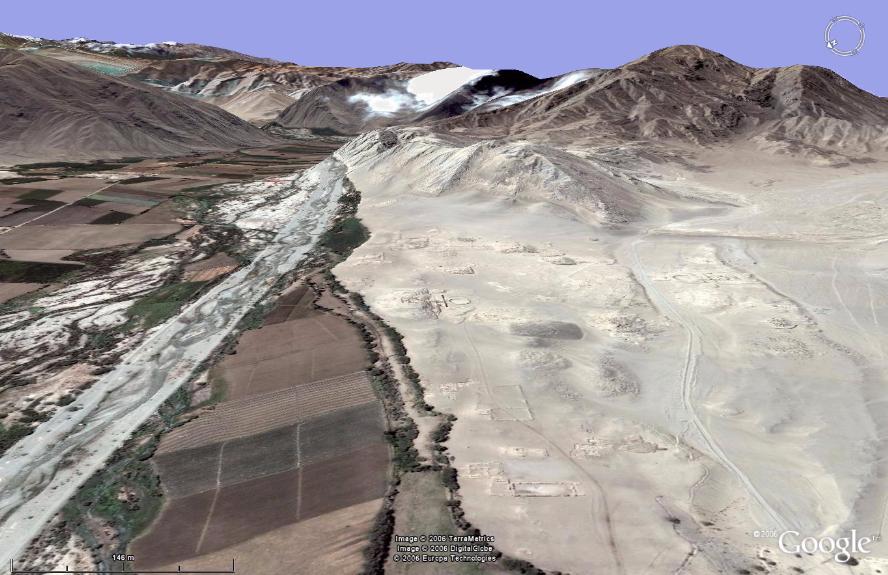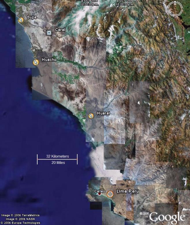 Google Earth is a powerful satellite image viewing system that can be obtained free of charge from http://earth.google.com/ . With this software users can view satellite images covering most of the world with medium resolution images (LandSat). High resolution images (QuickBird) are increasingly available in many regions, including remote places. The Caral-Supe region and its ruins have been covered by high resolution images perhaps due to its archaeological interest. |
