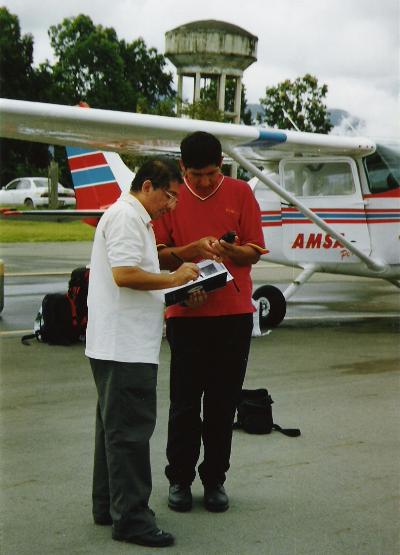 . . . . Jorge Gómez and Joel Rivera preparing technical details of the expedition with maps and GPS. . . . . Preparación de los detalles de la expedición con mapas y Sistema de Posicionamiento Global. . . . . .