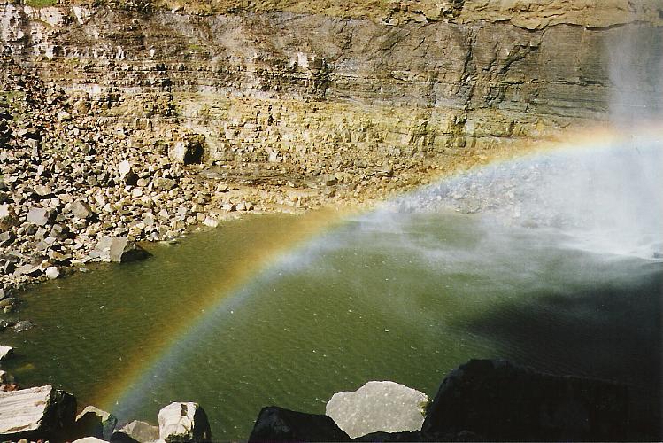 Rainbow over pond under great Parijaro waterfall