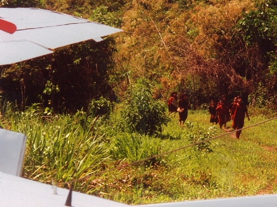 Niños como comité de recepción en pista de aterrizaje en Cuti. Children act as reception committe in landing strip at Cuti.