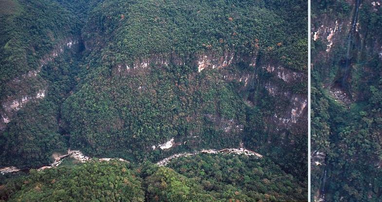 Catarata doble en quebrada del Cutivireni. Detalle muestra dos cuevas bajo catarata superior.