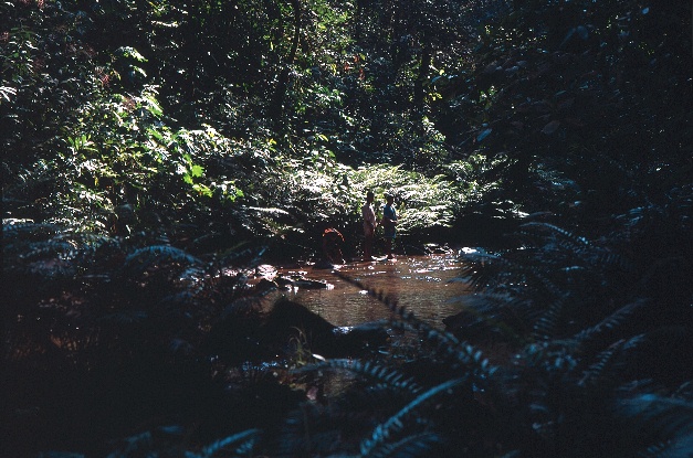 Three Ashaninka guides refreshing themselves in route to Tsiapo waterfalls . . . . . . Tres guías Asháninkas refrescándose en ruta hacia cataratas de Tsiapo