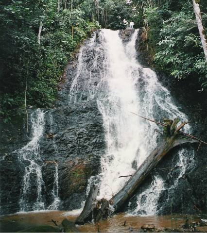 "Nymph" waterfall. (Note man standing on top) . . . Catarata "La Ninfa". (Notar a hombre parado en la parte superior). . . .