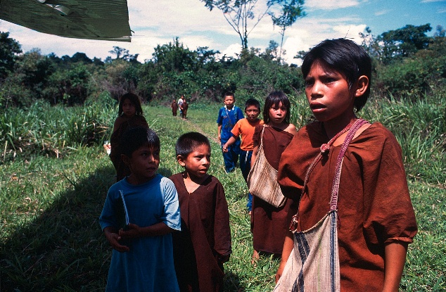Ashaninka children receiving plane in airstrip. . . . Niños Asháninkas recibiendo avión en pista de aterrizaje. . . .