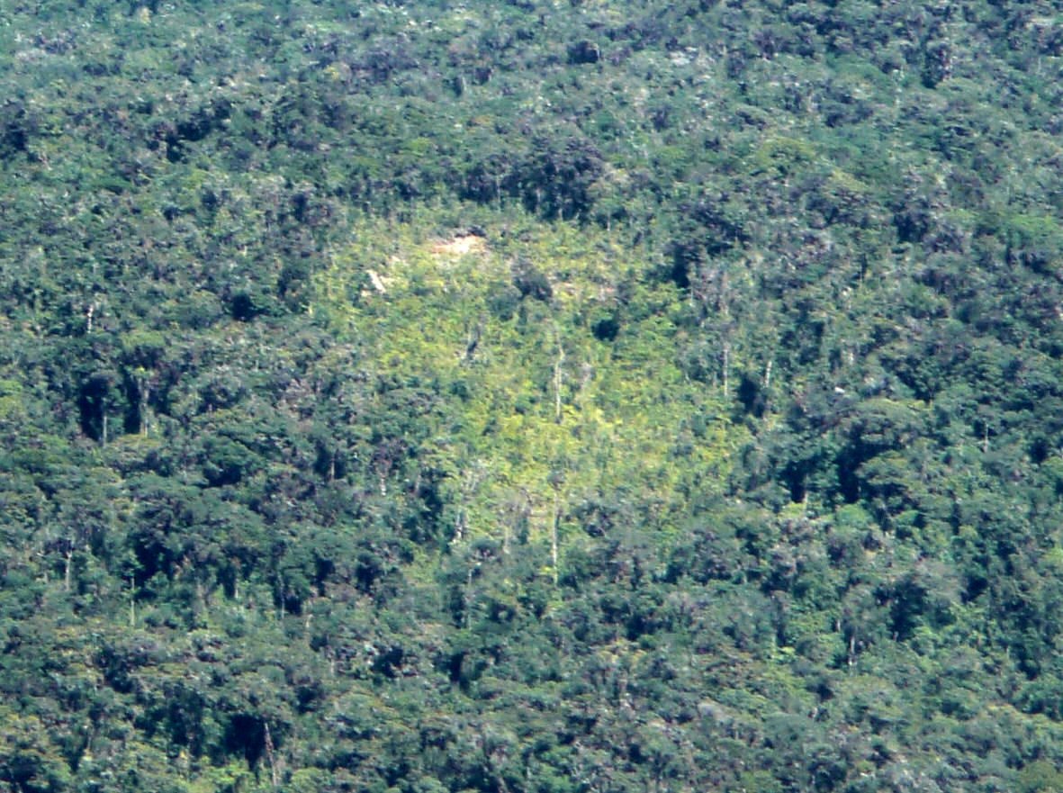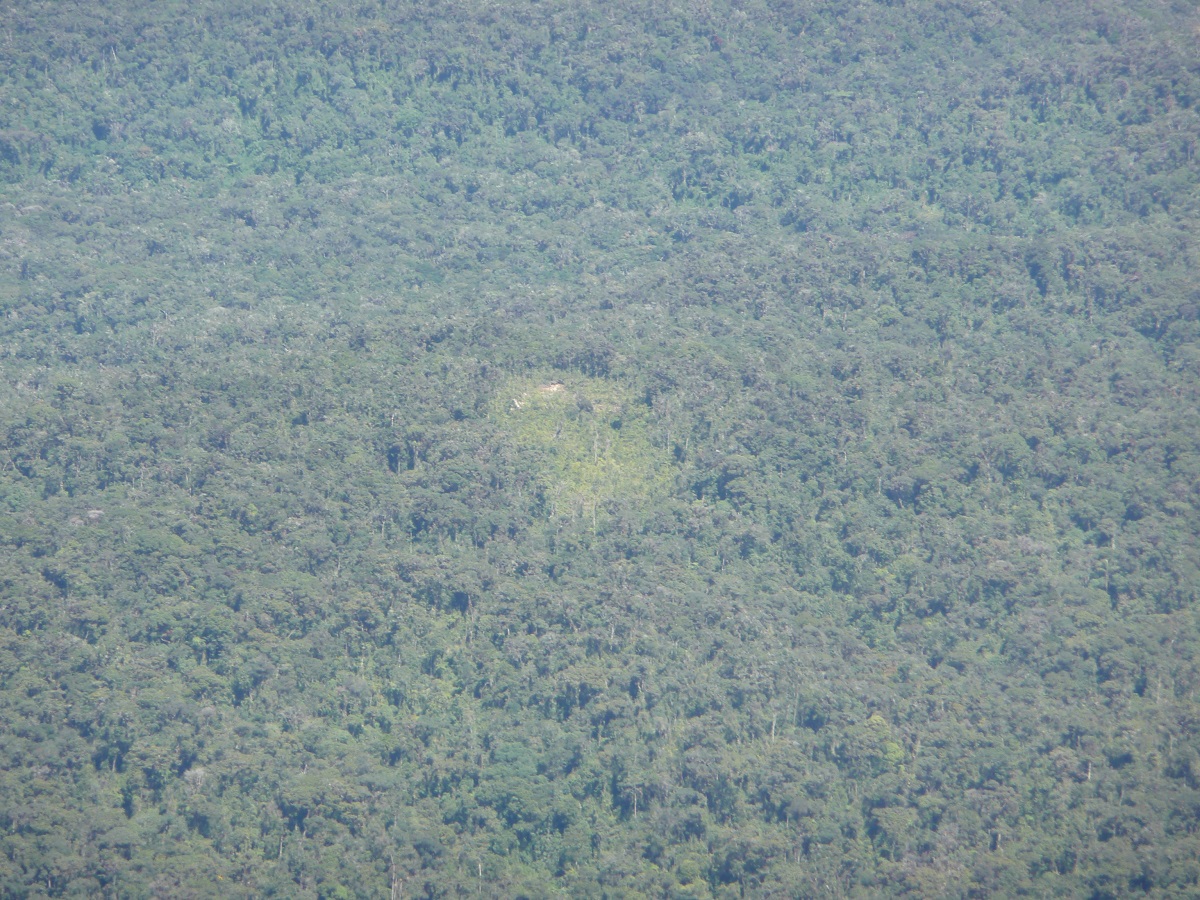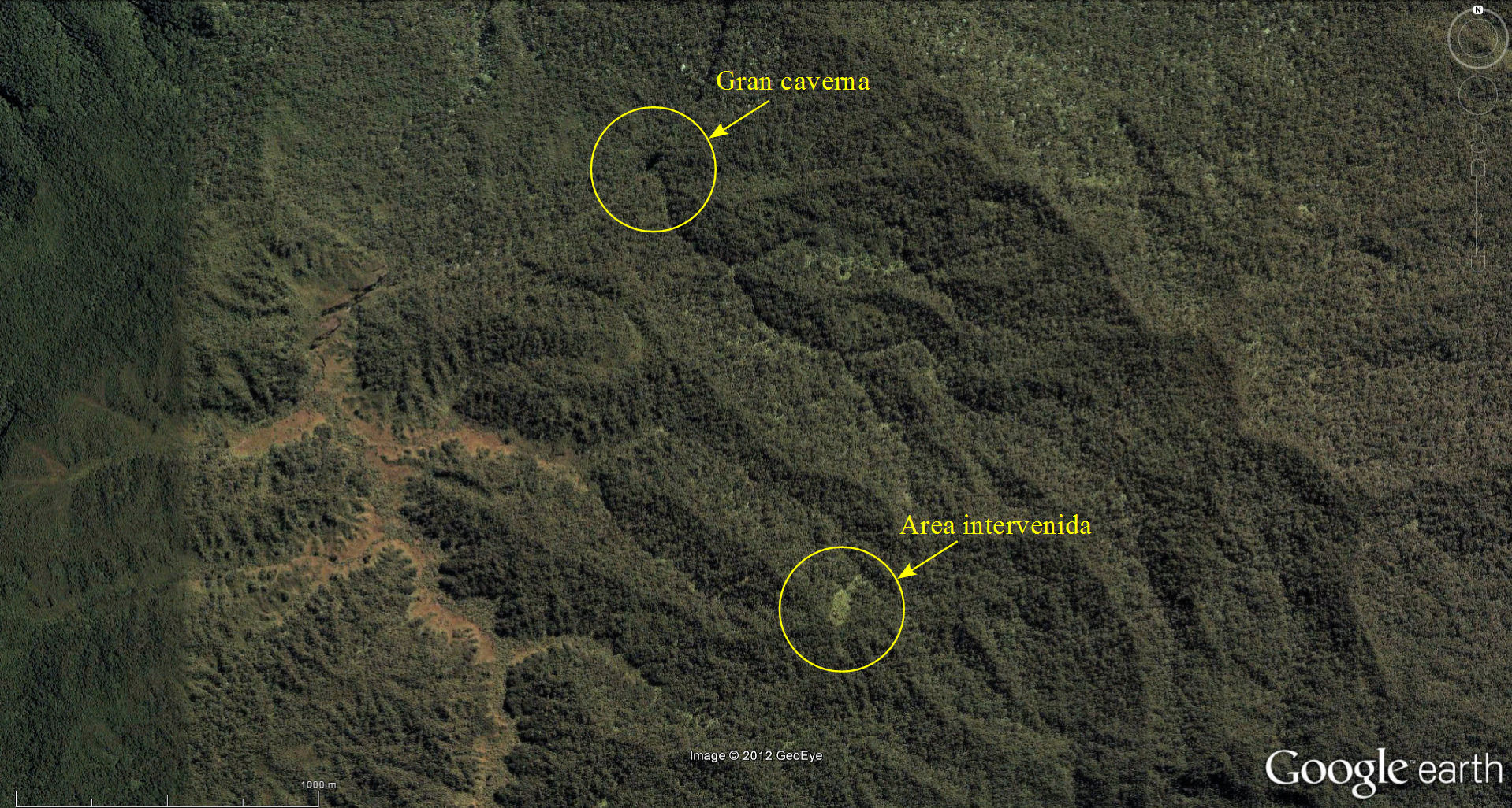 mountain range. Less than 2 km from a newly found cave (Image 1) there is a plot of about 100 meters long by 50 meters wide which reveals recent human activity as is clearly shown in Image 2. This image is part of a June 2008 image taken by the Czech forestry specialist Petr Nemec on a flight over the plateaus of Otishi National Park. This plot and the location of the cavern can be seen in an image taken from Google Earth (Image 3) showing part of the geographical context in which it is located. The GPS clock synchronization with the clock of the digital camera used in the picture allowed us to locate the plot quite accurately on the map of Google Earth. The plot is located at an altitude of approximately 2700 meters above sea level, an unusual altitude for Ashaninka natives.