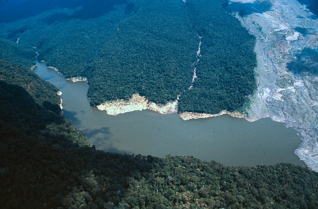 Lake on Mayoventi river, caused by landslide (at right) in 1947 earthquake . . . . . . Lago sobre el río Mayoventi causado por derrumbe (a la derecha) en 1947