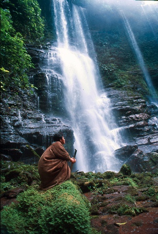 View of main fall of Tsiapo waterfalls with native sitting on rock covered with vegetation . . . . . . Vista de la principal caída de las cataratas de Tsiapo con nativo sentado sobre roca con vegetación