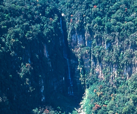 Large waterfall near Parijaro. Note the three small falls into which it divides at the bottom. . . . . . . Gran catarata cercana a la de Parijaro. Notar las 3 pequeñas cascadas en las que se divide en la sección inferior.